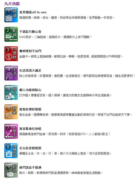 都能透過遙控器輕鬆操作,並提供豐富多樣化的內容,內含影城、世界頻道、卡拉OK、遊戲